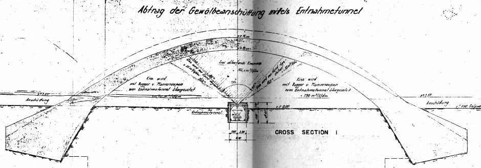 Unten in der Mitte ist der Entnahmetunnel sichtbar, in den der Kies abgelassen wurde
