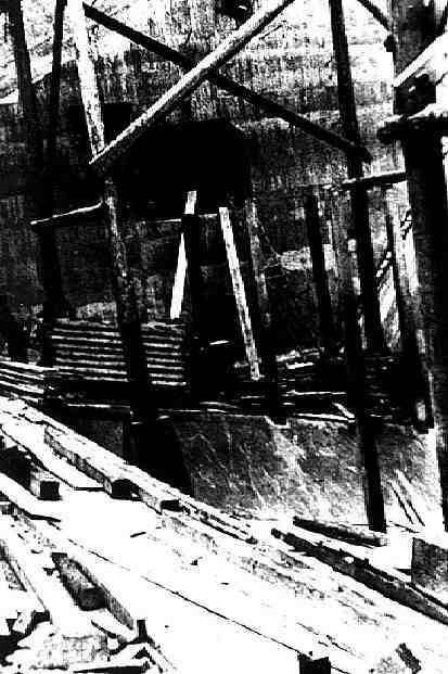 Das Widerlage wird gerade errichtet. In der Mitte befindet sich der Zugang zu den Längsstollen innerhalb der Widerlager