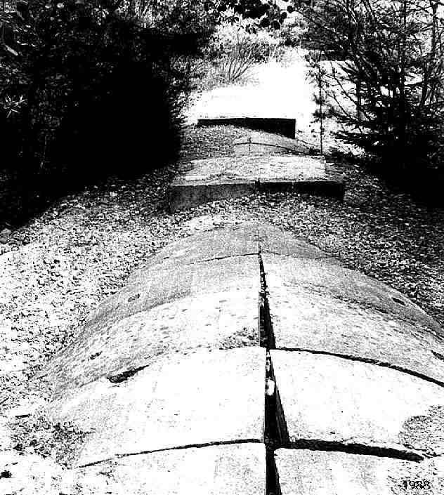 Die Aufnahme zeigt den unterirdisch verlaufenden Entnahmetunnel. Zur Errichtung der Flugzeughalle wurde zunächst dieser unterirdische Stollen aus Fertigbetonteilen mit viereckigen Einlassöffnungen nach oben errichtet, anschließend darüber Erdreich angehäuft und dann über dieses Erdreich die Betonhülle der Flugzeughalle gelegt. Nach Abhärtung des Betons wurde das Erdreich durch die viereckigen Einlassöffnungen in den Entnahmetunnel abgelassen, wo Werksbahnen bereitstanden zum Abtransport des Erdreiches. |