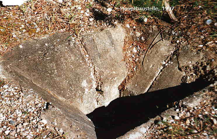 Die Aufnahme zeigt die Einlassöffnung am unterirdisch verlaufenden Entnahmetunnel. Der eigentliche Schließautomatismus ist heute nicht mehr vorhanden. Zur Errichtung der Flugzeughalle wurde zunächst dieser unterirdische Stollen aus Fertigbetonteilen mit viereckigen Einlassöffnungen nach oben errichtet, anschließend darüber Erdreich angehäuft und dann über dieses Erdreich die Betonhülle der Flugzeughalle gelegt. Nach Abhärtung des Betons wurde das Erdreich durch die viereckigen Einlassöffnungen in den Entnahmetunnel abgelassen, wo Werksbahnen bereitstanden zum Abtransport des Erdreiches. |