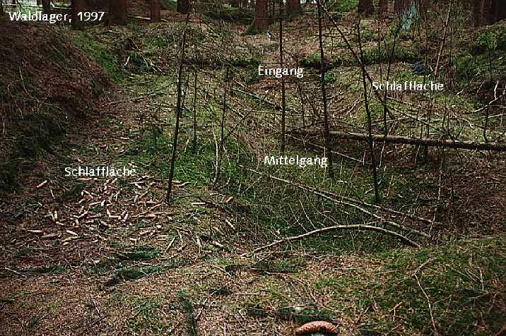 Das Bild zeigt heute noch sichtbare Vertiefungen innerhalb des Waldlagers - hier die Vertiefungen für die Erdhütten des Winterlagers.