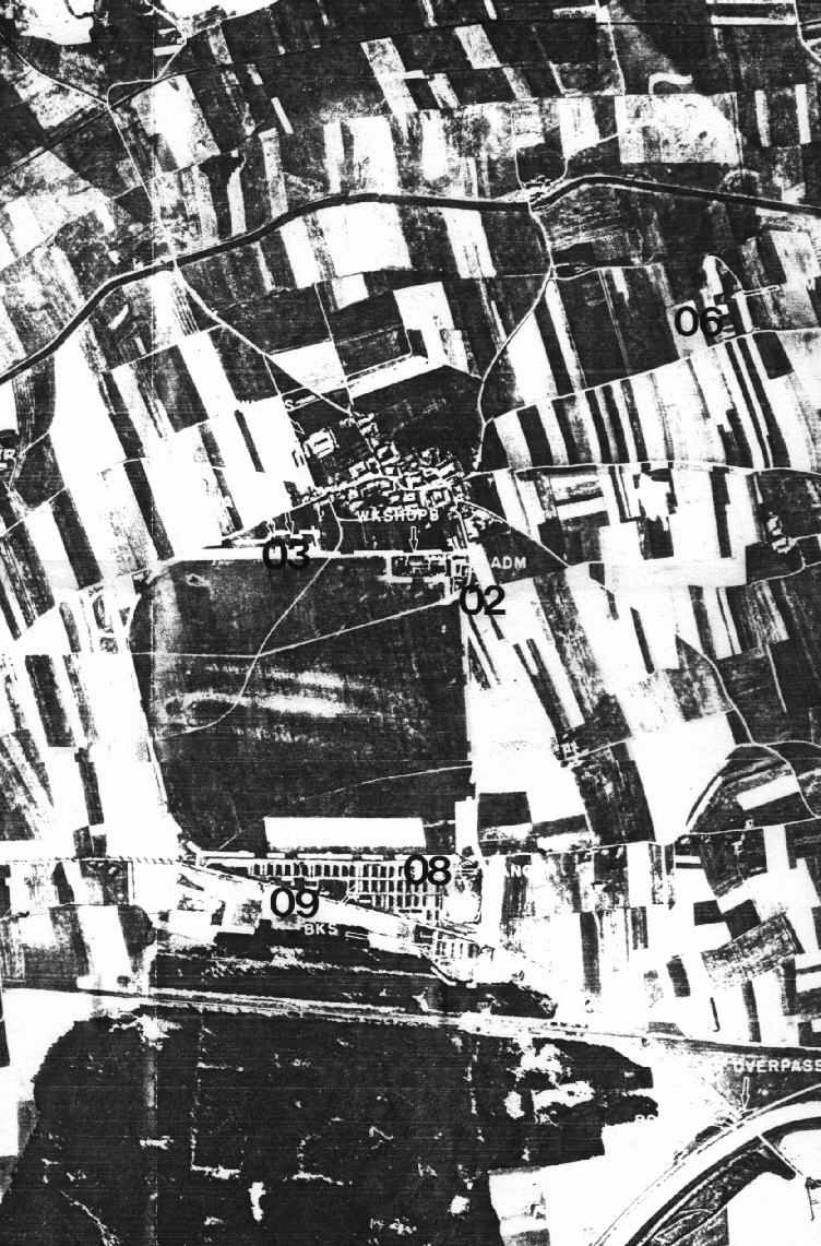 Unmittelbar südlich davon, links der Straße nach Ampfing, befindet sich ein wesentlich kleineres Kriegsgefangenenlager. Ziffer 6) bezeichnet das Munitionsdepot, Ziffer 3) die Flugzeughallen, Ziffer 2 das Landgut. |