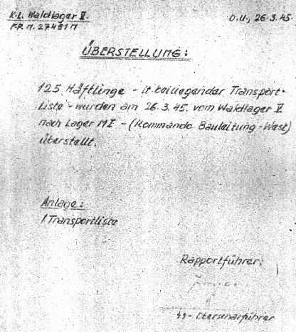 Notiz über die Überstellung von Häftlingen aus dem Waldlager in das Lager Mettenheim