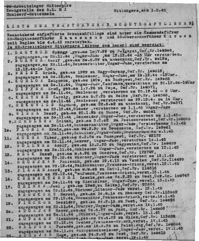 Die Totenliste aus Mittergars Die Toten wurden in einem Massengrab unmittelbar hinter dem Lager im Wald vergraben. Nach dem Krieg mussten ehemalige Nazis die Gräber öffnen und die Toten nach Lohen umbetten. Später wurde auch dieses Grab aufgelöst und die Opfer wurden in eine der größeren Grabstätten in Kraiburg, Mühldorf und Neumarkt St. Veit verlegt. Eine Liste der verstorbenen Schutzhäftlinge führt 42 Personen auf.