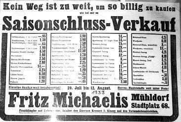 Fritz Michaelis und seine Ehefrau Eva Michaelis waren jüdische Kaufleute in Mühldorf (zugezogen 1931 aus Passau) und betrieben am Stadtplatz 68 ein Bekleidungsgeschäft. Die Gewerbekartei bezeichnete das Kaufhaus als "Spezialhaus für Herren- und Knabenbekleidung für Mühldorf". Fritz Michaelis hat dieses Gewerbe am 01.03.1931 in Mühldorf angemeldet. Nach Aussage der Familie Michaelis soll das Geschäft "gut gegangen" sein. Im übrigen war Michaelis nach dem Bericht von Zeitzeugen in der Bevölkerung wohl angesehen; Konflikte waren nicht bekannt. Schon bald nach der Machtergreifung durch die Nationalsozialisten änderte sich die Lage jedoch grundlegend: Noch am 29. Juli 1933 durfte Michaelis in einem Inserat der Mühldorfer Zeitung für sein Kaufhaus Werbung betreiben und auf den kommenden Saisonschlussverkauf hinweisen. In dem Inserat wies er insbesondere darauf hin, dass er im ersten Weltkrieg Frontkämpfer und Unteroffizier gewesen sei und das Eiserne Kreuz 2. Klasse sowie das Verwundetenabzeichen erhalten habe. Hintergrund dieser Herausstellung war wohl ein Erlass des Reichswirtschaftsministers, wonach ein Jude, der den Nachweis führen konnte, im 1. Weltkrieg mindestens ein Jahr an der Front gekämpft zu haben, in wirtschaftlicher Hinsicht nicht diskriminiert werden durfte. Ende Mai 1935 - die Nationalsozialisten hatten inzwischen ihre Repressionen gegenüber der jüdischen Bevölkerung deutlich verschärft - wurden bei Michaelis die großen Schaufensterscheiben zertrümmert, der Rest mit Farbe beschmirrt. Im Januar 1936 erschien in der Mühldorferr Zeitung ein Artikel, der einen Geschäftsmann anprangerte, weil er Arbeitsanzüge "beim Juden" gekauft hatte. Kurze Zeit vorher hatte die Mühldorfer Zeitung am 02. Juli 1935 unter der Überschrift "Kauft nicht bei Juden!" einen Hinweis des örtlichen Kreisleiters Fritz Schwaegerl, veröffentlicht, wonach jemand, der sich mit Juden einlasse, mit "keiner Unterstützung zu rechnen habe". Die Familie Michaelis sah darauf hin wohl keine Zukunft mehr für sich in Deutschland und tat in dieser Situation das einzig richtige: sie verkaufte ihr Geschäft an das Geschäftsunternehmen Gustav Daxenberger und flüchtete mit dem Erlös nach Amerika. Die Firma Daxenberger besaß schon seit dem Jahr 1799 am Stadtplatz 43 ein Geschäft für "Textilien aller Art" und betrieb das von Michaelis erworbene Geschäft am Stadtplatz 68 weiter als Nebenverkaufsstelle seines Haupthauses. In der Mühldorfer Zeitung vom 16. April 1937 erschien hierzu folgendes Inserat: "Das Spezialhaus für Herren- und Knabenbekleidung - bisher Fritz Michaelis in Mühldorf - habe ich übernommen und werde dasselbe als rein arisches Unternehmen am Samstag, den 17. April 1937 eröffnen." Kurz vorher, am 09. April 1937 hatte die Mühldorfer Zeitung bereits triumphierend verkündet, es sei der Diszipliniertheit der Volksgenossen zu verdanken, die dem Aufruf Folge geleistet hätten, nicht bei Juden zu kaufen. Der Familie Michaelis gelang die Flucht nach Amerika - hatte sie doch noch rechtzeitig genug erkannt, dass ein Verbleib in Deutschland für sie den sicheren Tod bedeutet hätte - und siedelte sich in New York an. Dort verstarb Fritz Michaelis im Alter von 52 Jahren. In der Nachkriegszeit wurde 1948 ein Rückerstattungsverfahren "wegen des früher dem rassisch Verfolgten Michaelis gehörenden Geschäfts am Stadtplatz 68" gegen die Firma Daxenberger eingeleitet. In einem Vergleich einigten sich die Parteien auf die Zahlung eines Geldbetrags in Höhe von DM 2.000.-.